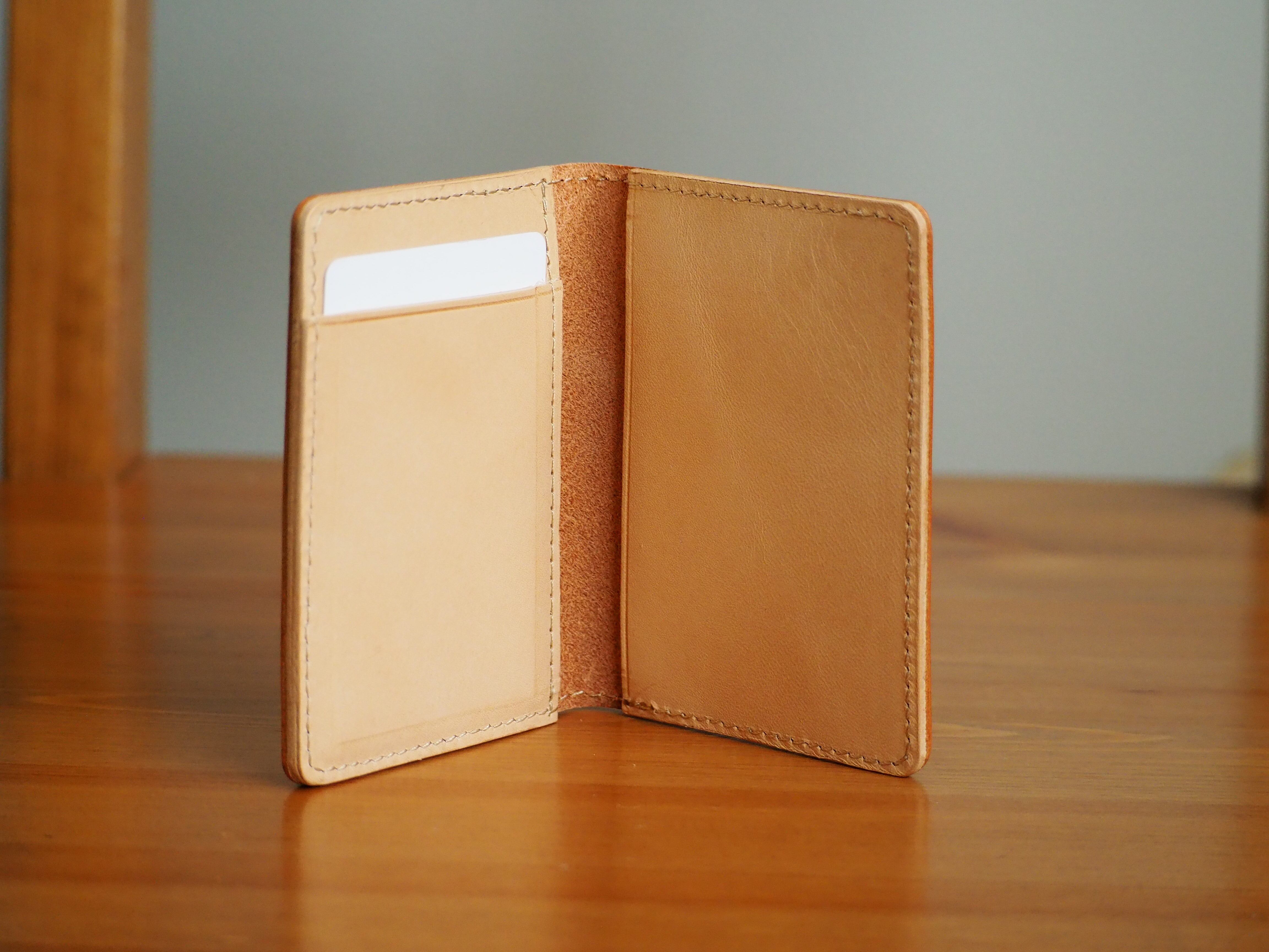 カードポケットはあまり余裕を持たせず、全体的にコンパクトサイズにしております。開いた時の両側ポケットには2枚ずつカード収納が可能です。左側に付いている前ポケットは1枚入れられます。