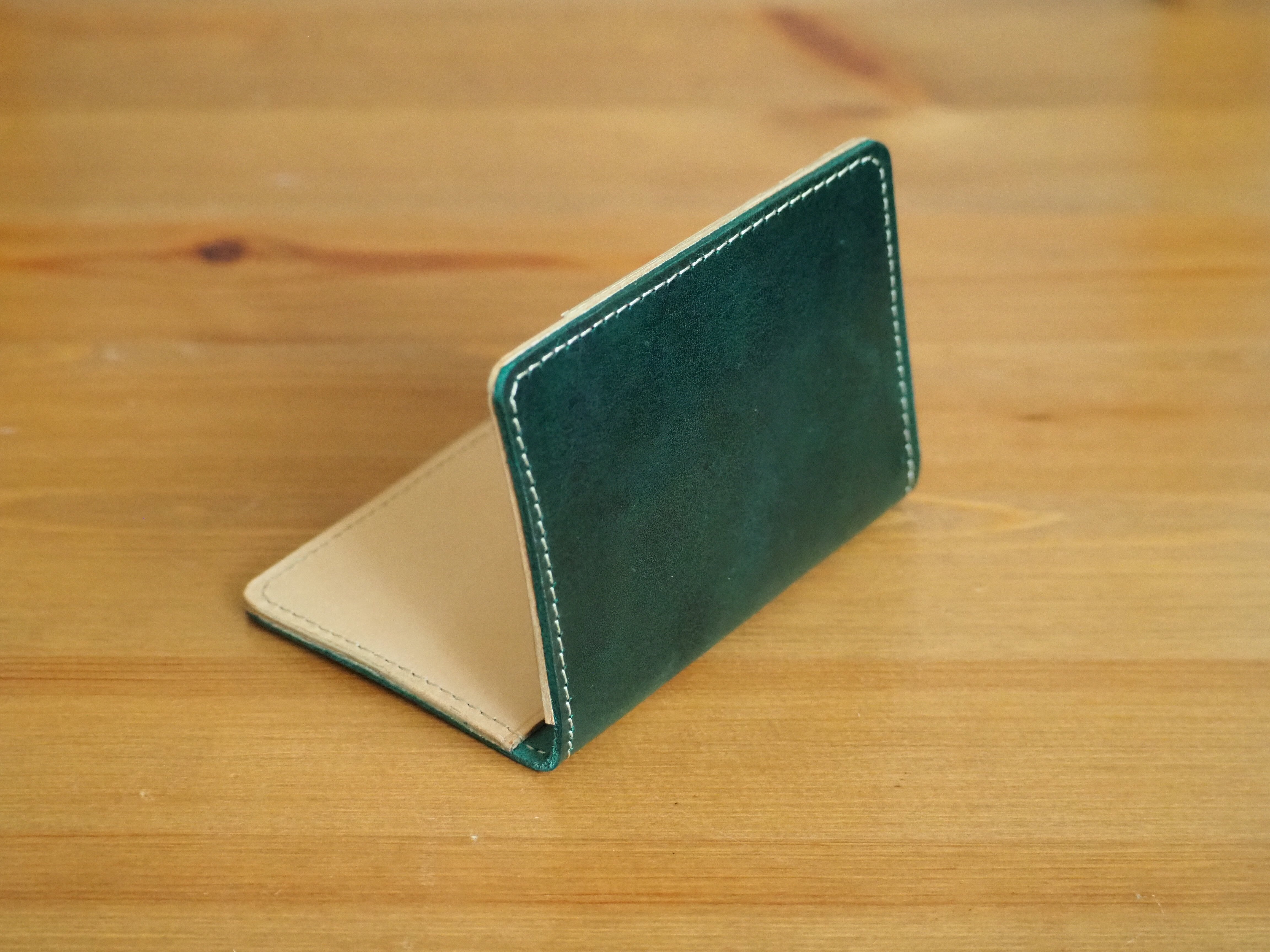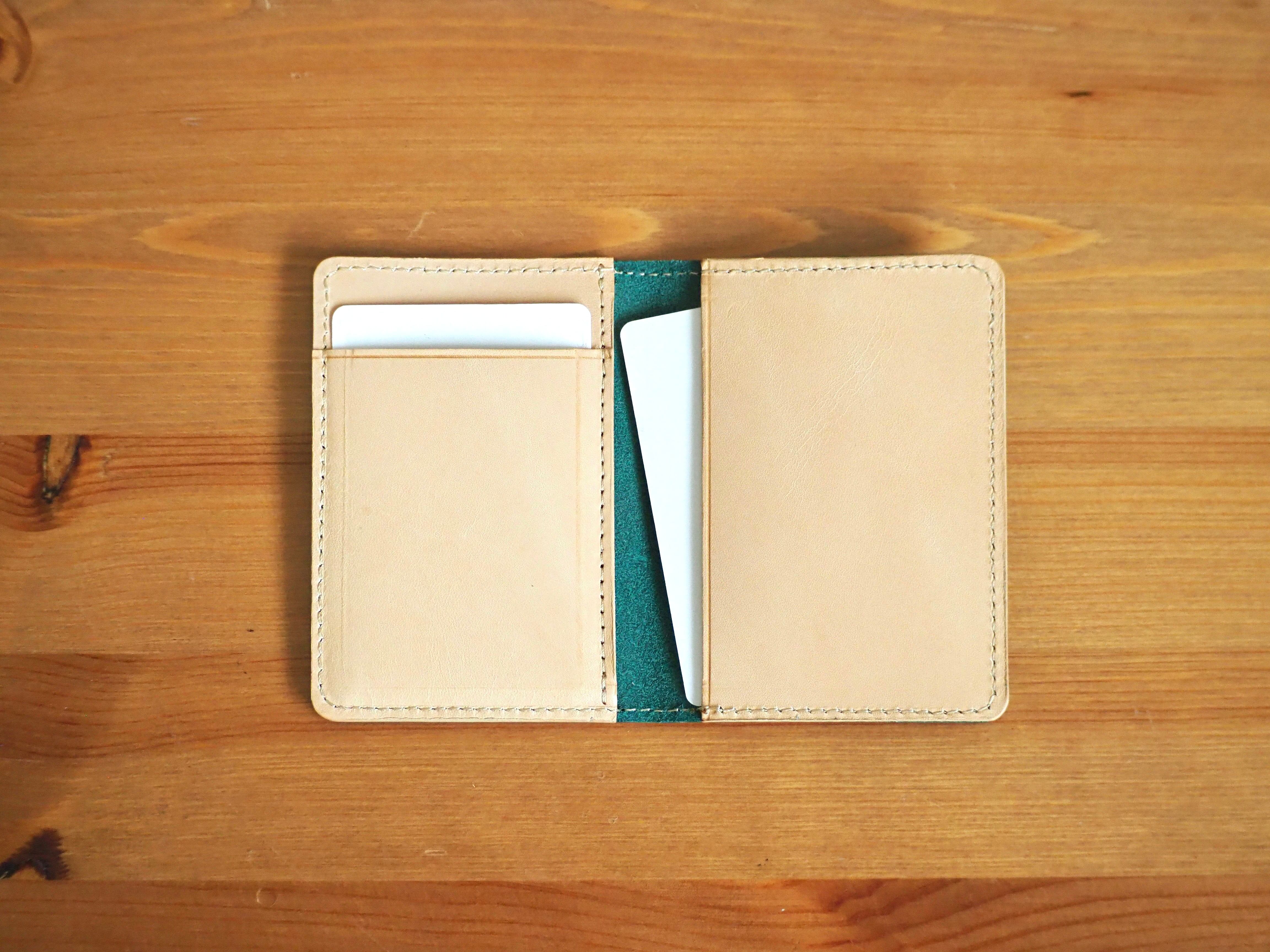 カードポケットはあまり余裕を持たせず、全体的にコンパクトサイズにしております。開いた時の両側ポケットには2枚ずつカード収納が可能です。左側に付いている前ポケットは1枚入れられます。