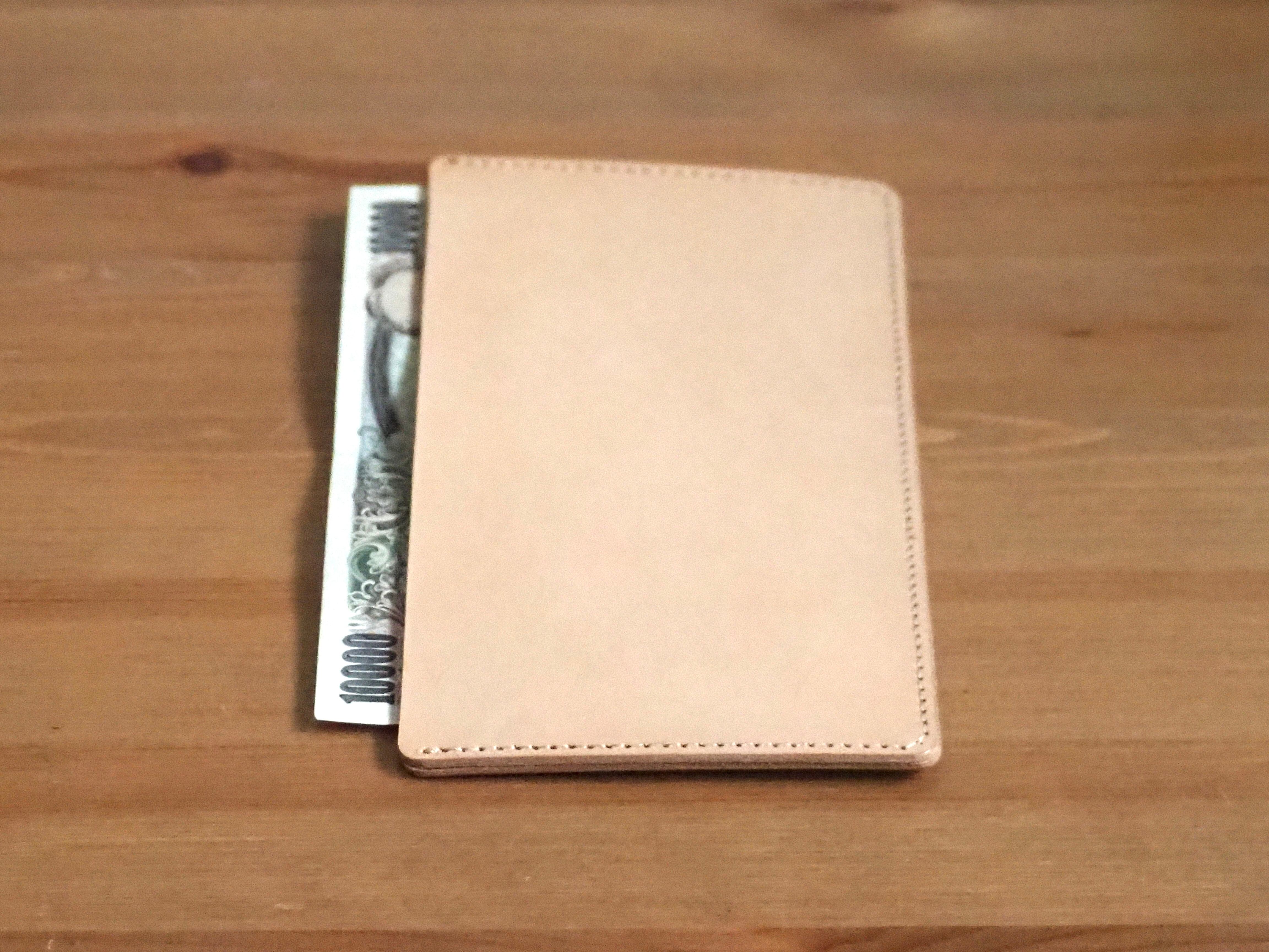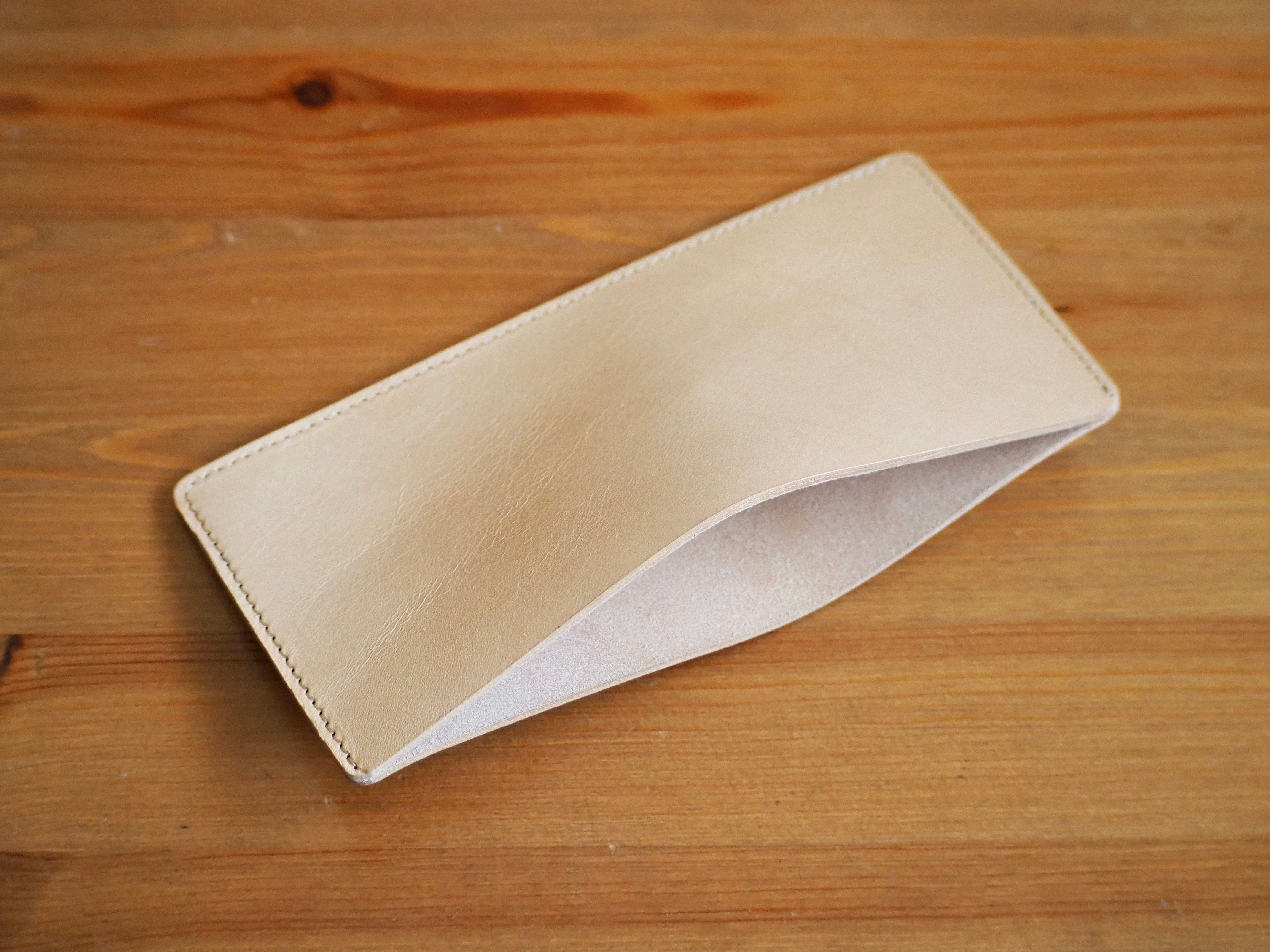 小銭入れ、カード入れが付いていない厚み約3mmのシンプルな薄型札入れです。通常のお財布(横幅約190〜200mm)に比べ、お札を入れることだけを考えている為、お札がちょうど入るくらいの寸法で作りました。