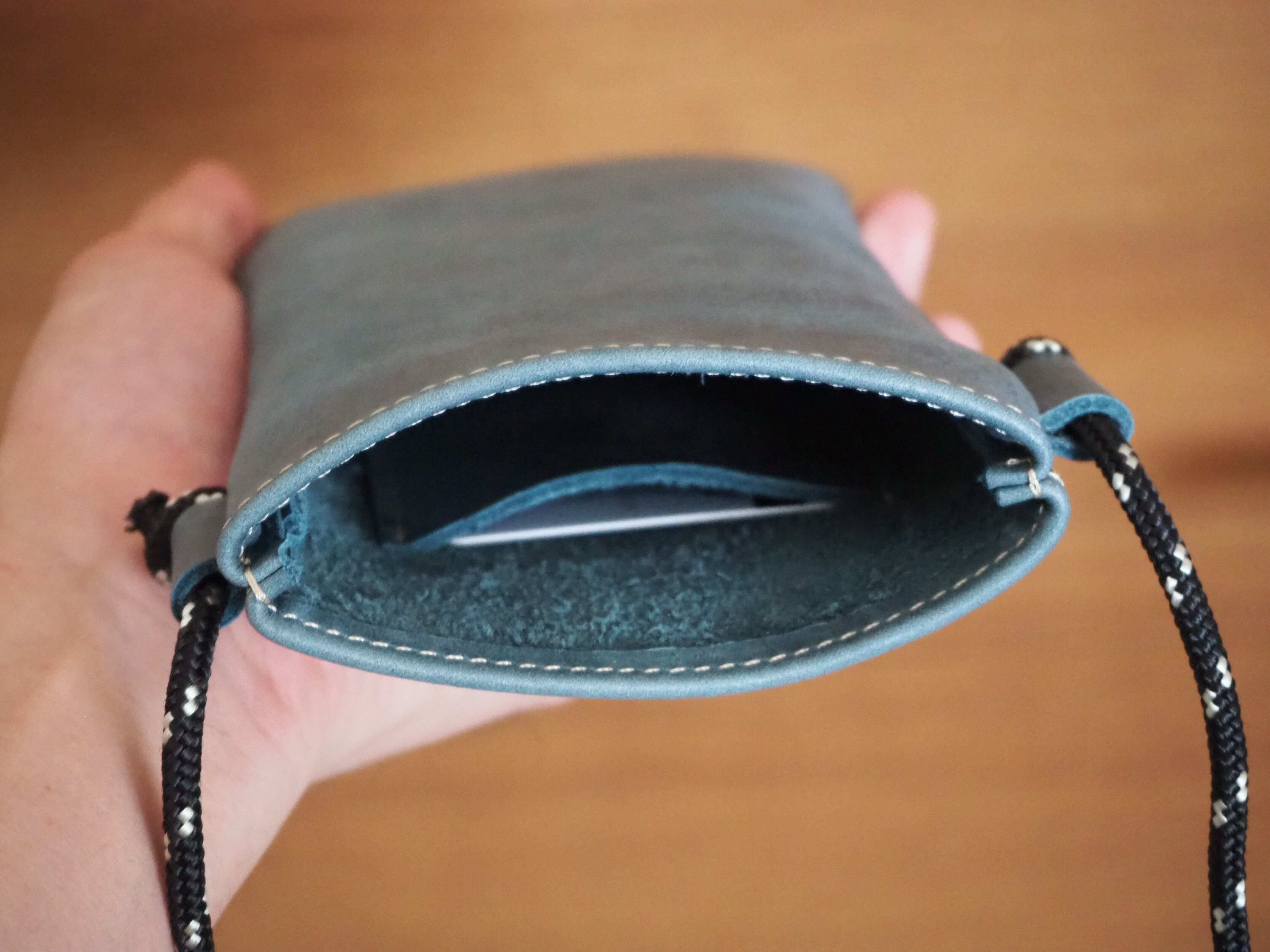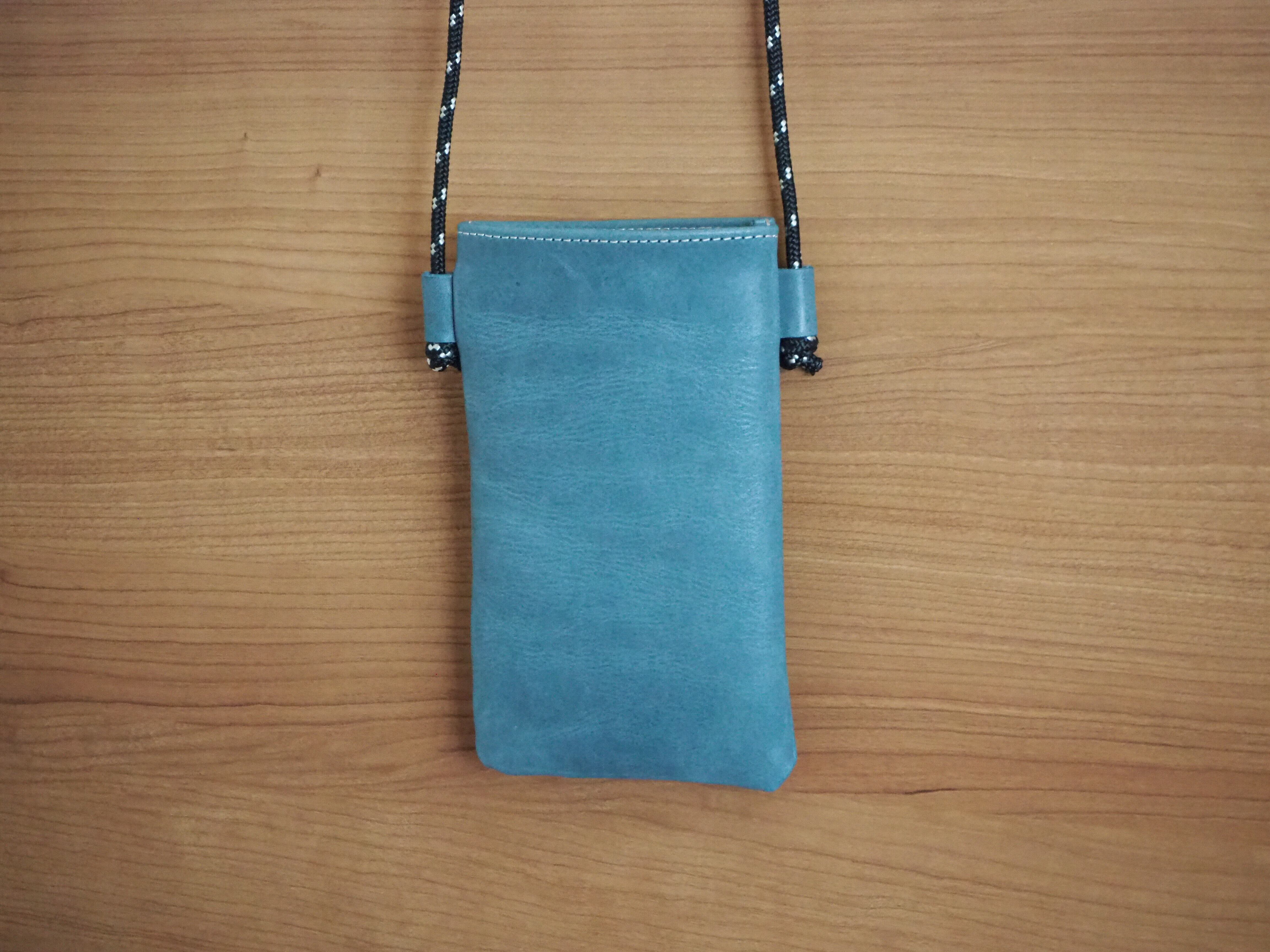 柔らかめの国産牛革を使用したスマホポシェットです。タンニンなめしの革にワックスを染み込ませておりますので、使用していくうちに革の表面がピカピカになっていきます。