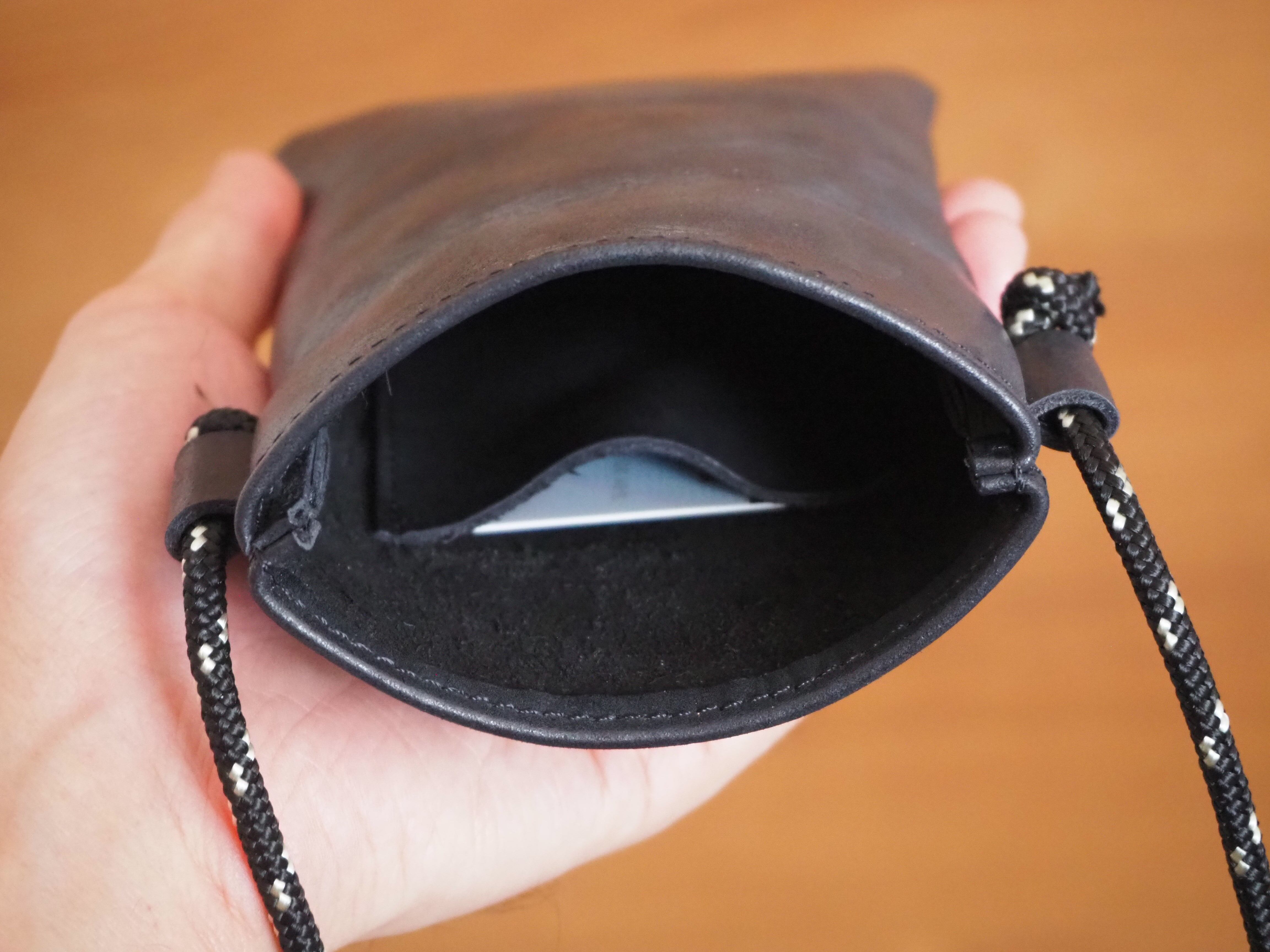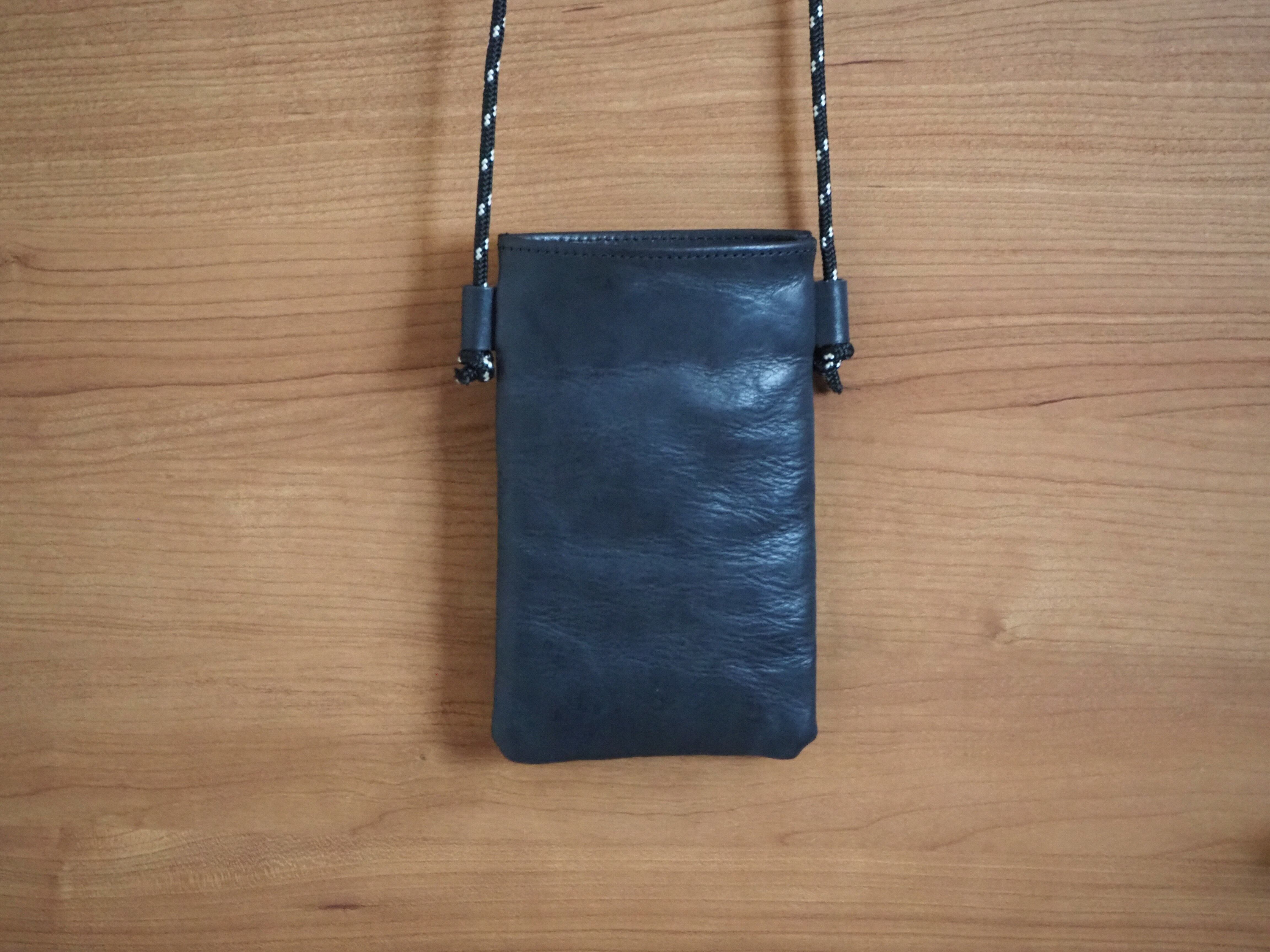 柔らかめの国産牛革を使用したスマホポシェットです。タンニンなめしの革にワックスを染み込ませておりますので、使用していくうちに革の表面がピカピカになっていきます。