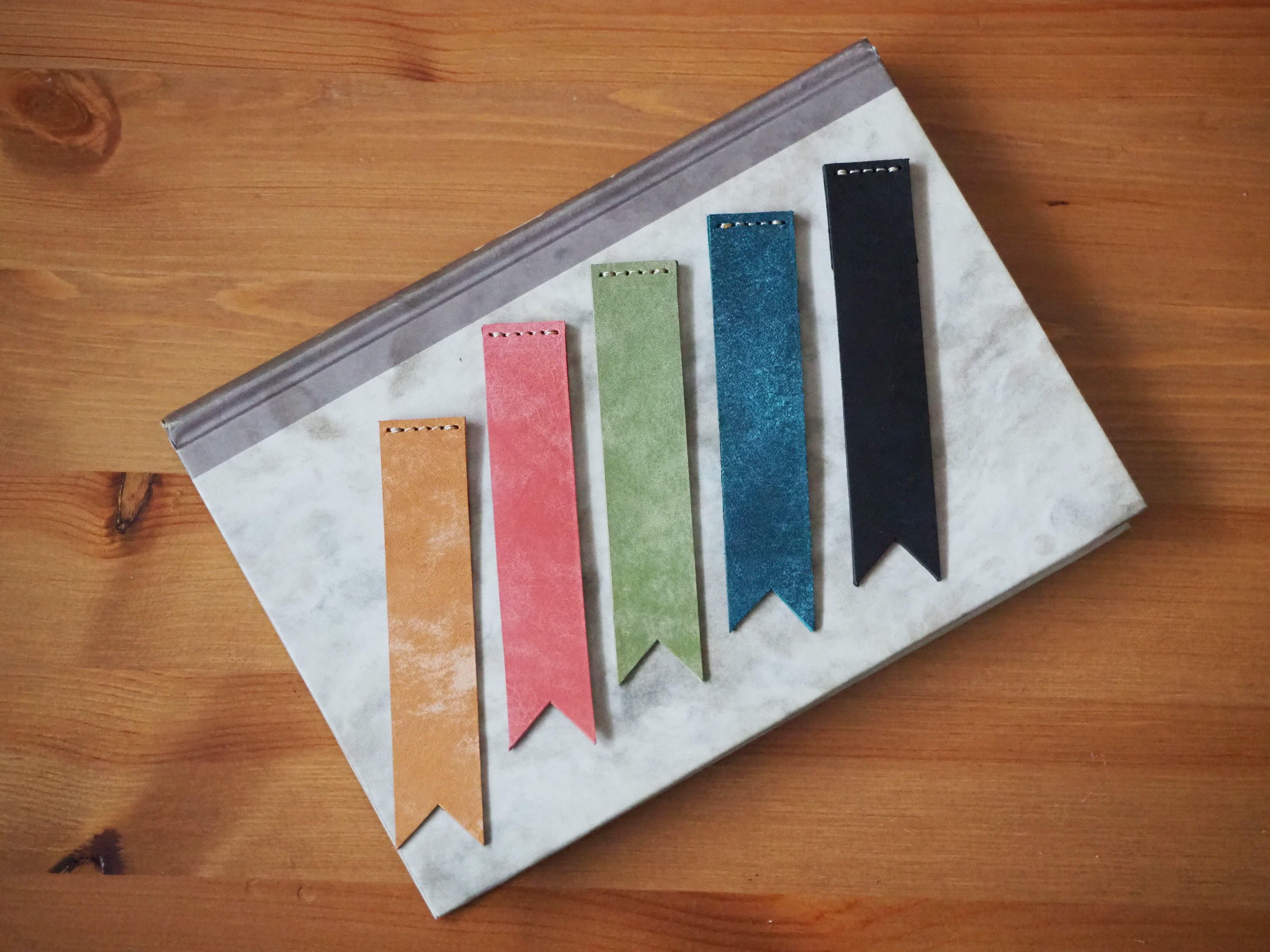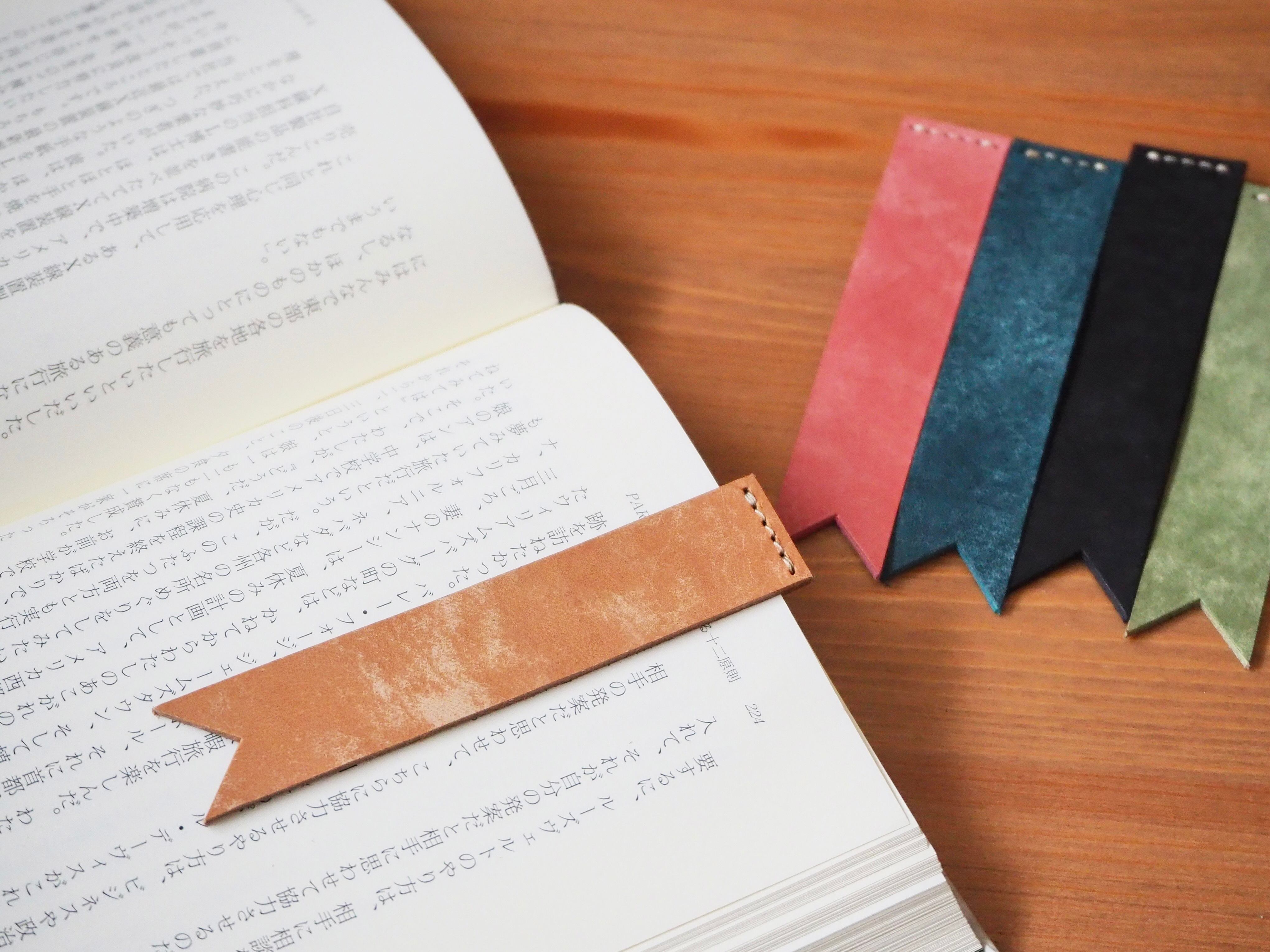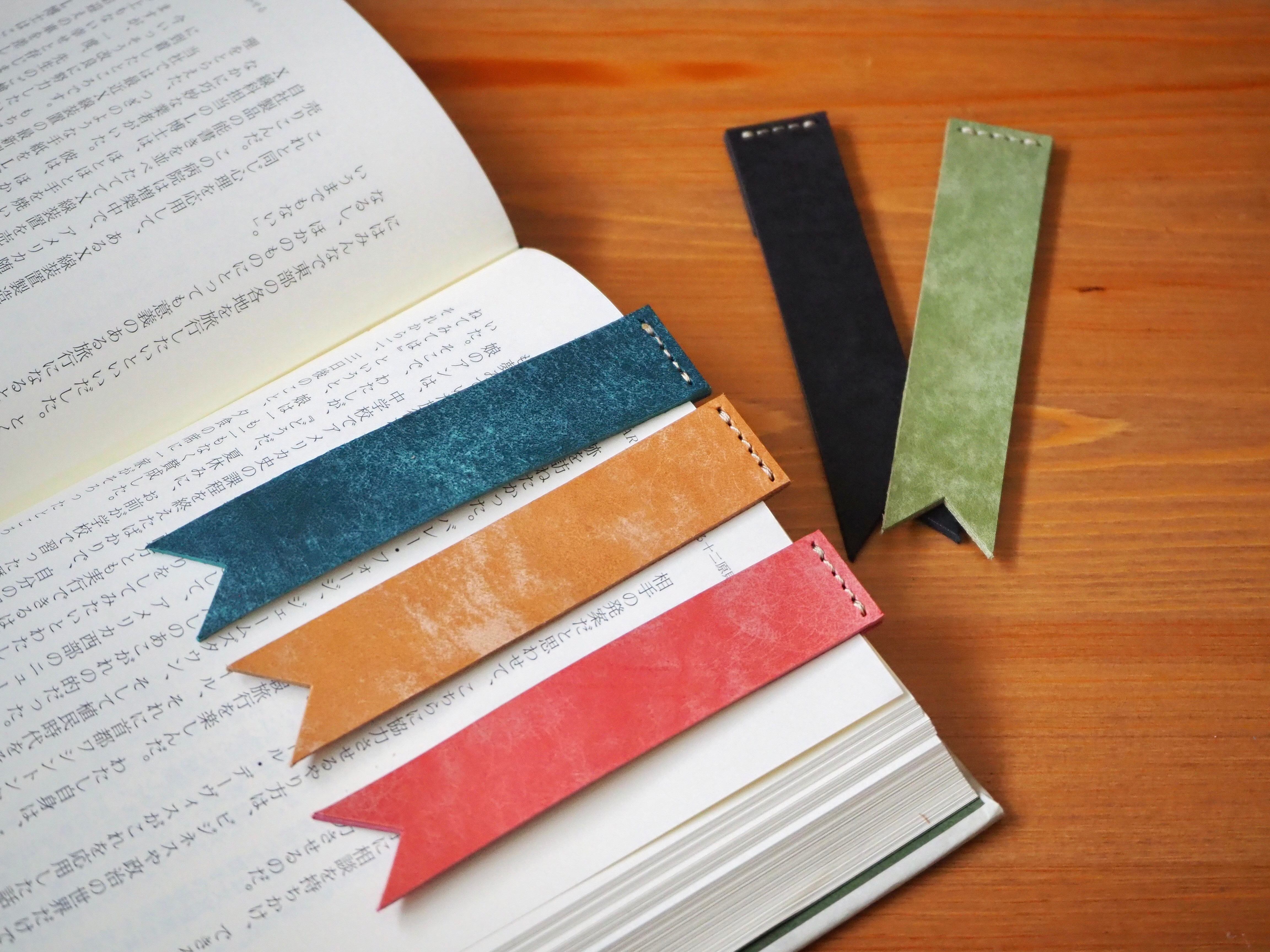 発色の良いイタリアンレザーを使用した栞になります。表面を削って加工した革で、色ムラがあるような表情をしていますが、馴染んでくると色が変わって濃くなっていきます。