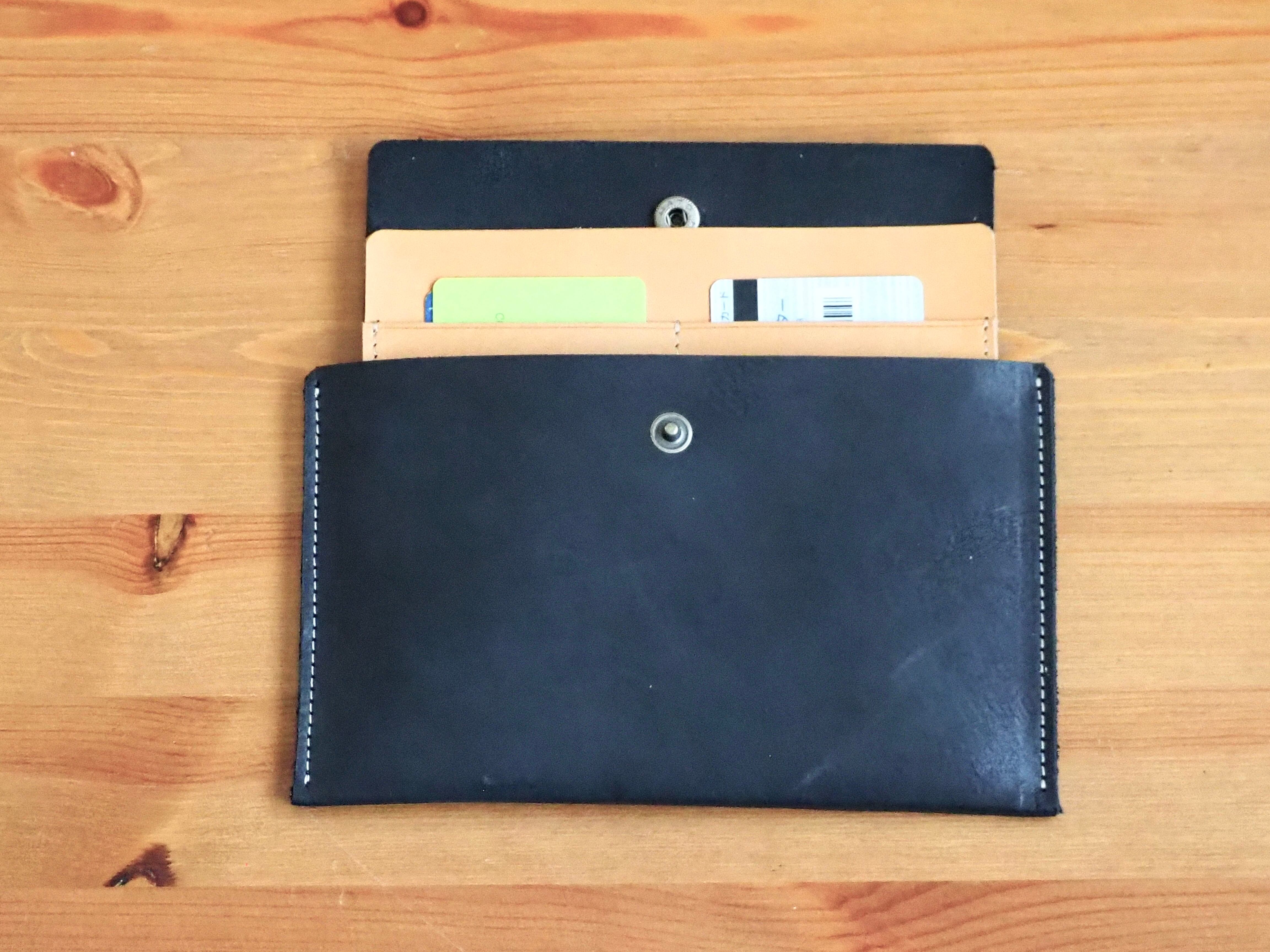 母子手帳とお薬手帳が1冊ずつ、計2冊入るサイズになっており、内装には取り外し可能なヌメ革のカードホルダーも入っておりますので、カードや診察券の収納も可能です。
